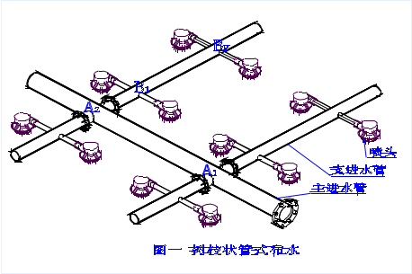 逆流冷卻塔循環水系統的布水方式采用管式布水,呈樹枝狀,循環水先進入主管,然后進入支管,再進入噴頭,主管、支管、噴頭相互垂直,如圖一。根據流體狀態方程:壓力(P)×流速(V)=常數(K),循環水從主管流經A1點、A2點后,到達主管末端,由于冷卻塔布水需要主管末端是封閉的,因此流速(V)急劇下降,壓力(P)急劇上升,所以A2處比A1處水壓頭大,同理B2處比B1處水壓頭大,綜上分析各布水噴頭處的水壓頭不相